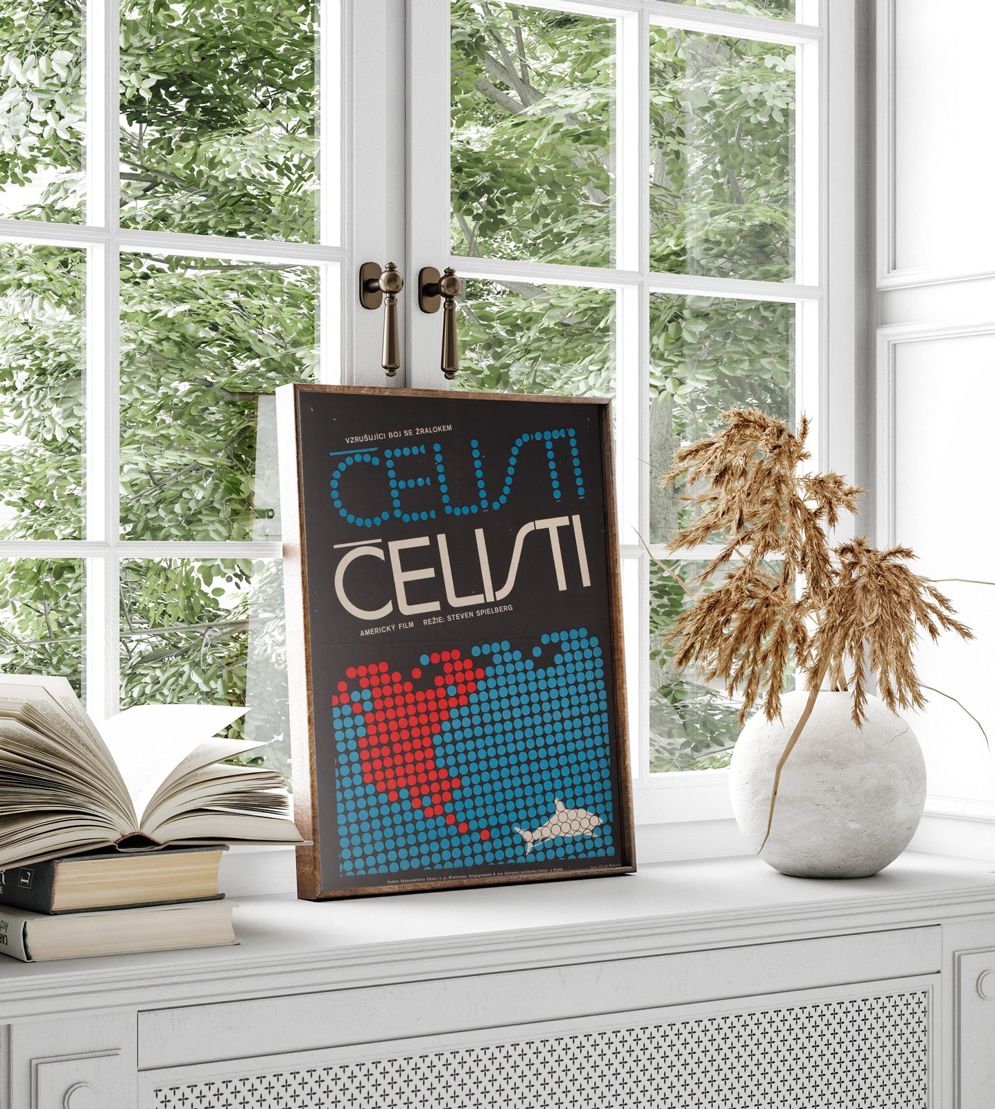 This Czech poster for Jaws, designed by Olga Fischerová, delivers a bold, minimalist spin on Steven Spielberg’s legendary shark thriller. Its clever dot-matrix layout, sharp typography, and vivid contrast between blood-red and ocean-blue capture the film’s rising tension and unmistakable shark presence. Spielberg’s classic had thrilled audiences worldwide, powered by standout performances from Roy Scheider, Robert Shaw, and Richard Dreyfuss. Today, Fischerová’s striking design stands out as a must-have piece for fans of Jaws, shark movie art, Czech poster design, and vintage film memorabilia.