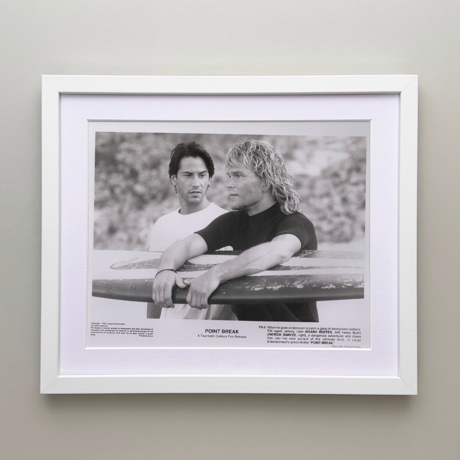 Original 8x10 inches Press Publicity Still for Point Break (1991) starring Keanu Reeves, Patrick Swayze and Gary Busey and directed by Kathryn Bigelow.