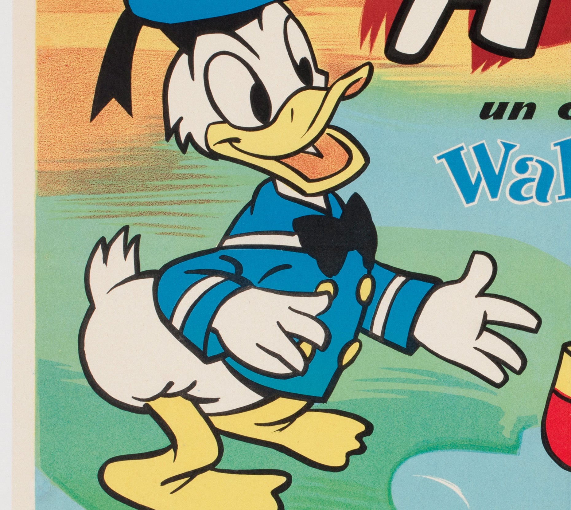 This bright and colourful French poster from the 1950s promotes Saludos Amigos — the sixth animated feature from Walt Disney Studios. Originally released in Latin America in 1942 and in the United States in 1943, Saludos Amigos marked a unique moment in Disney history as the first of the studio’s “package films,” combining several short segments into a single feature.