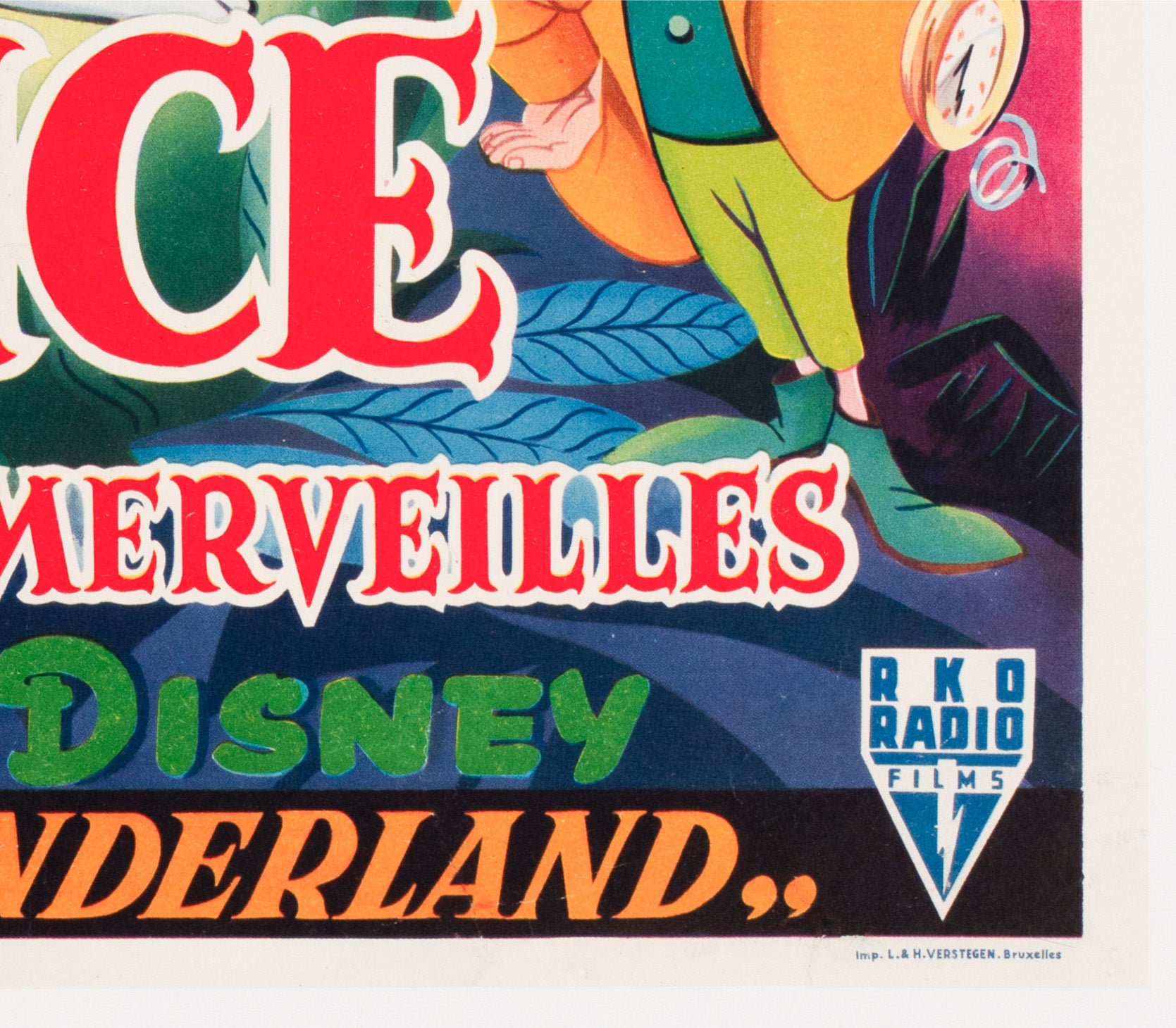 We love this vintage 1951 Belgian film poster for the Disney animated classic Alice in Wonderland. Based on Lewis Carroll's 1865 book, Alice's Adventures in Wonderland. The poster depicting Alice, the White Rabbit, and the Mad Hatter is based on Mary Blair's whimsical, modernist concept art. A superb poster in fantastic condition.