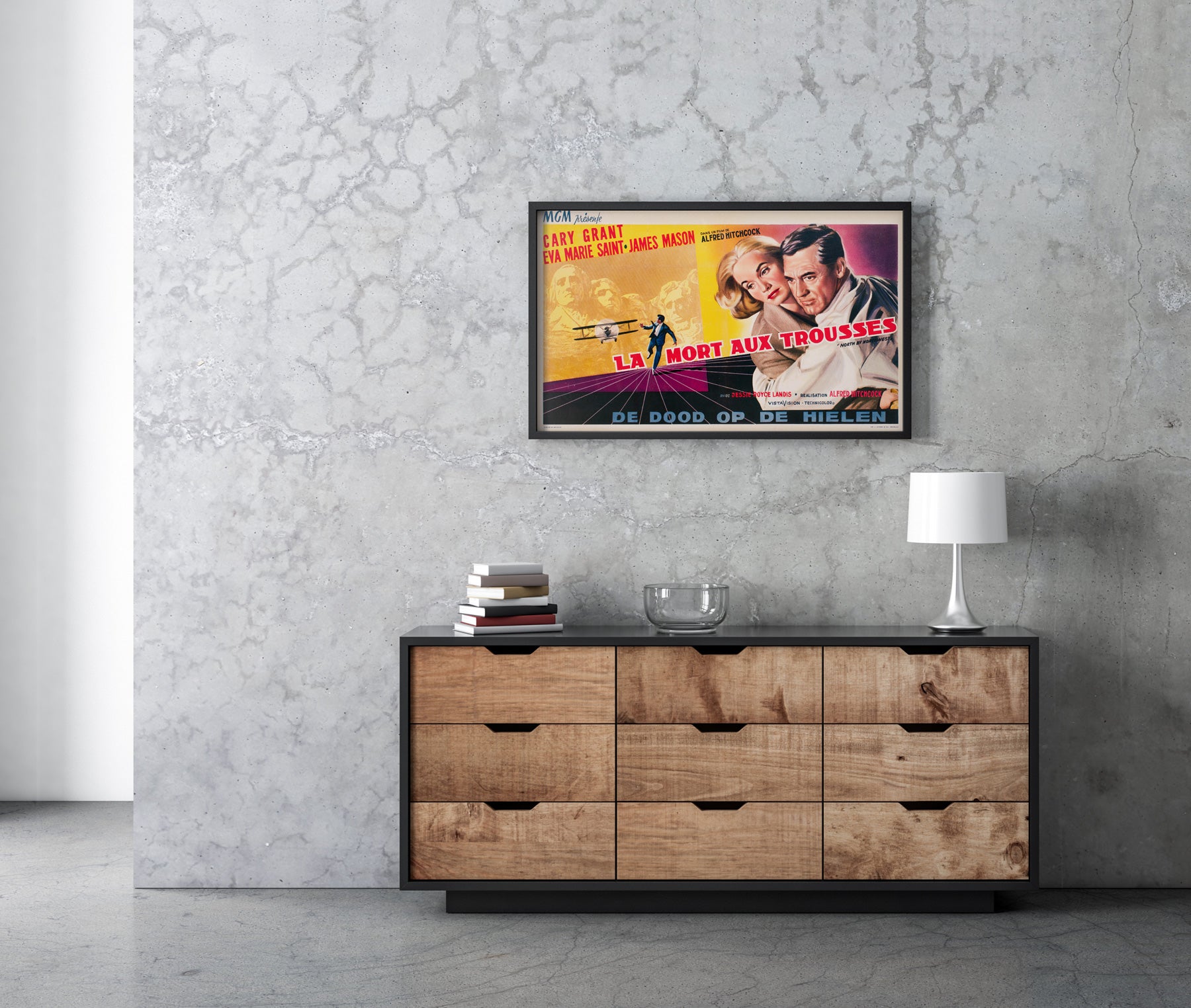 This original 1959 Belgian poster for Alfred Hitchcock’s North by Northwest — released in French-speaking regions as La Mort Aux Trousses — features distinctive painted artwork that sets it apart from the widely recognised Saul Bass designs used in the U.S. release.