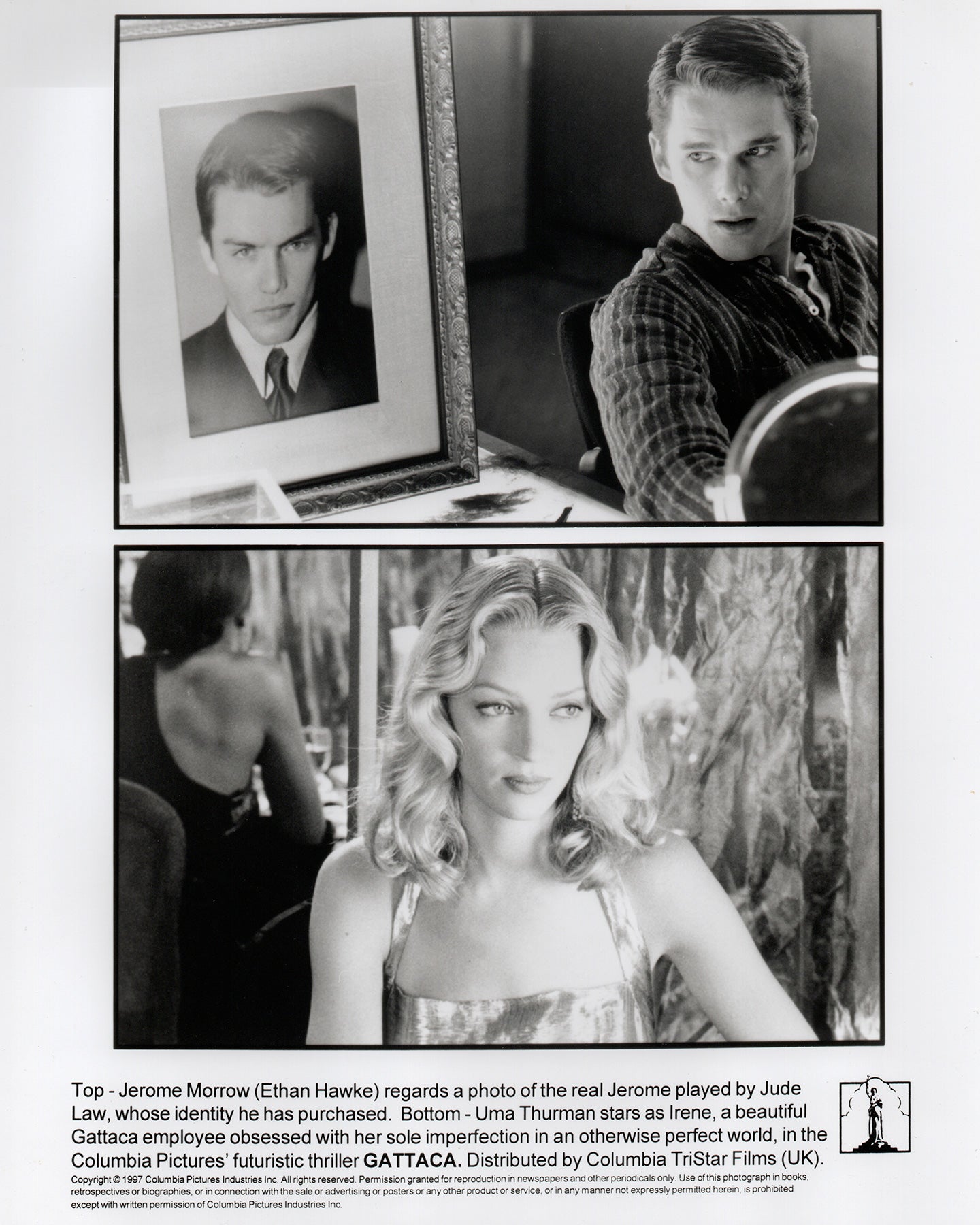 Original 8x10 inches Press Publicity Still for Gattaca (1997) starring Ethan Hawke, Uma Thurman and Jude Law and directed by Andrew Niccol.