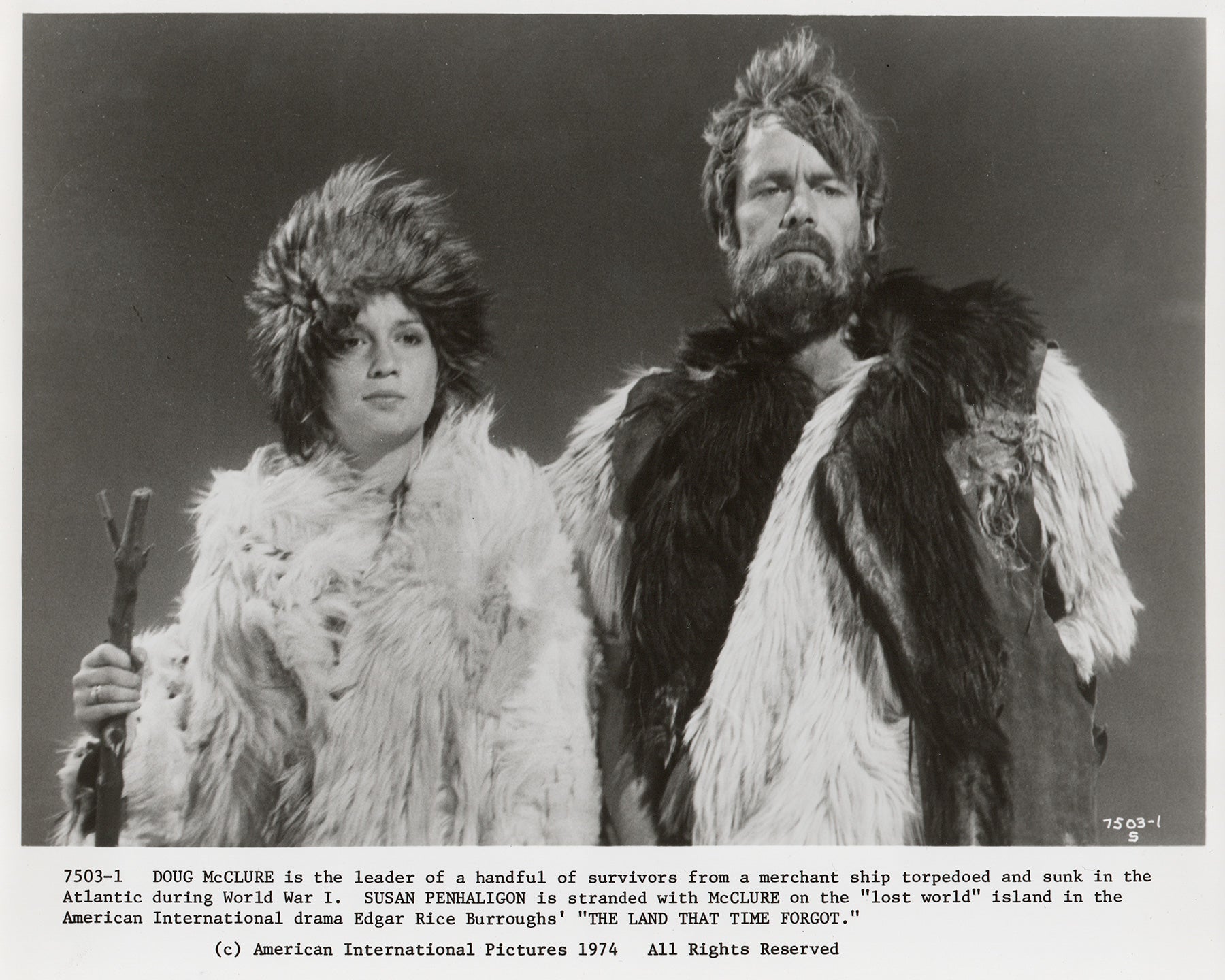 Original 8x10 inches Press Publicity Still for The Land that Time Forgot (1974) starring Doug McClure, John McEnery and Susan Penhaligon and directed by Kevin Connor.