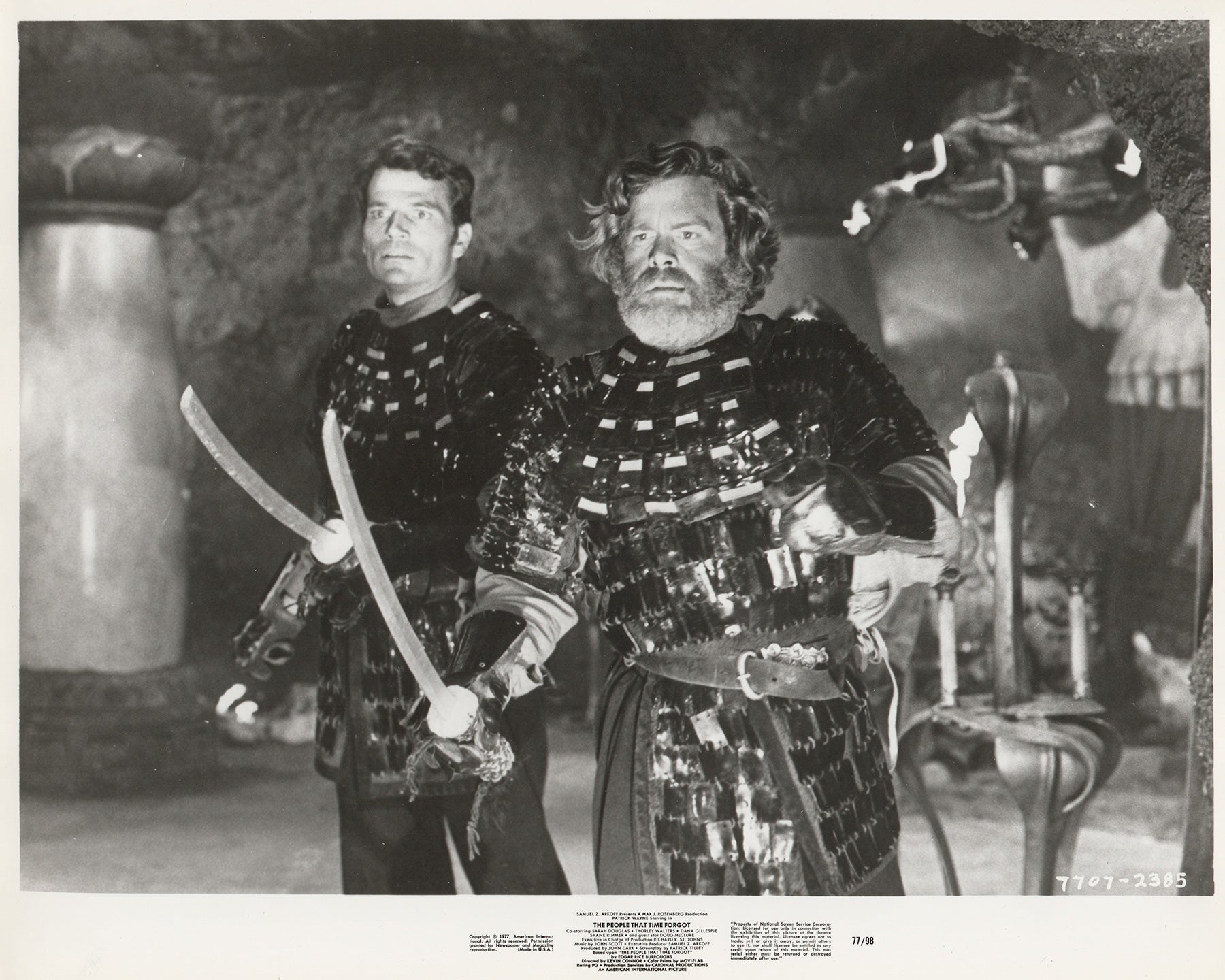 Original 8x10 inches Press Publicity Still for The People That Time Forgot (1977) starring Patrick Wayne, Sarah Douglas and Dana Gillespie and directed by Kevin Connor.